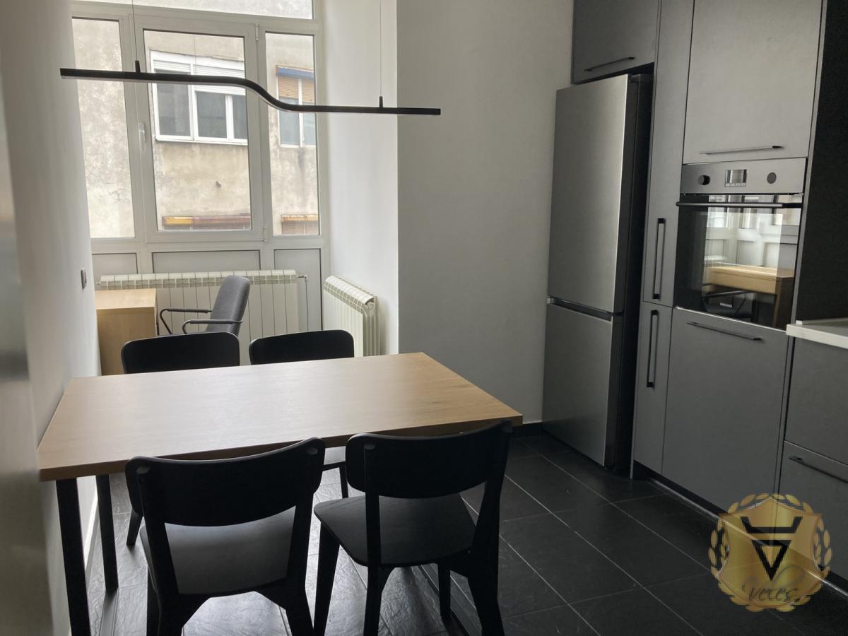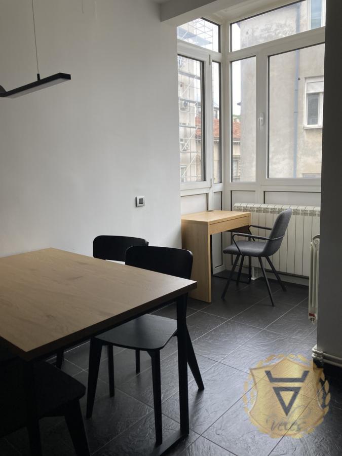 Izdajemo moderan, namesten, komforan, kompletno renoviran dvosoban stan na Vračaru u Braničevskoj ulici u neposrednoj blizini Hrama Svetog Save. Stan se sastoji od ulaznog hodnika, svetlog i prostranog dnevnog boravka sa pogledom na mirno dvoriste, velike spavaće sobe koja je opremljena francuskim ležajem, velikim radnim stolom sa podesivom visinom, kliznim plakarom i walk-in garderoberom i poseduje izlaz na zastakljenu terasu sa koje se pruža pogled na Hram Svetog Save. Kuhinja je prostrana, moderna, kompletno opremljena tehnikom, sa dodatnim stolom za ručavanje i radnim kutkom. Sva tehnika, namestaj i kuhinja u stanu su potpuno novi i nekorisceni. Stan je dvostrano orjentisan (istok-zapad) i nalazi se na drugom spratu dobro očuvane starije zgrade bez lifta, koja je nedavno kompletno renovirana. Grejanje je centralno i stan poseduje i dve inverter klime i aluminijumsku stolariju. Uz stan se moze koristiti i ogradjen podrum od 30m2. Zgrada poseduje privatno dvoriste koje predstavlja mirnu oazu u srcu grada. Stan se izdaje na minimalni period od godinu dana. Agencija za nekretnine Veles broj u registru posrednika 1149 Agencijska provizija 50%* Način plaćanja: kirija+depozit+ag.provizija