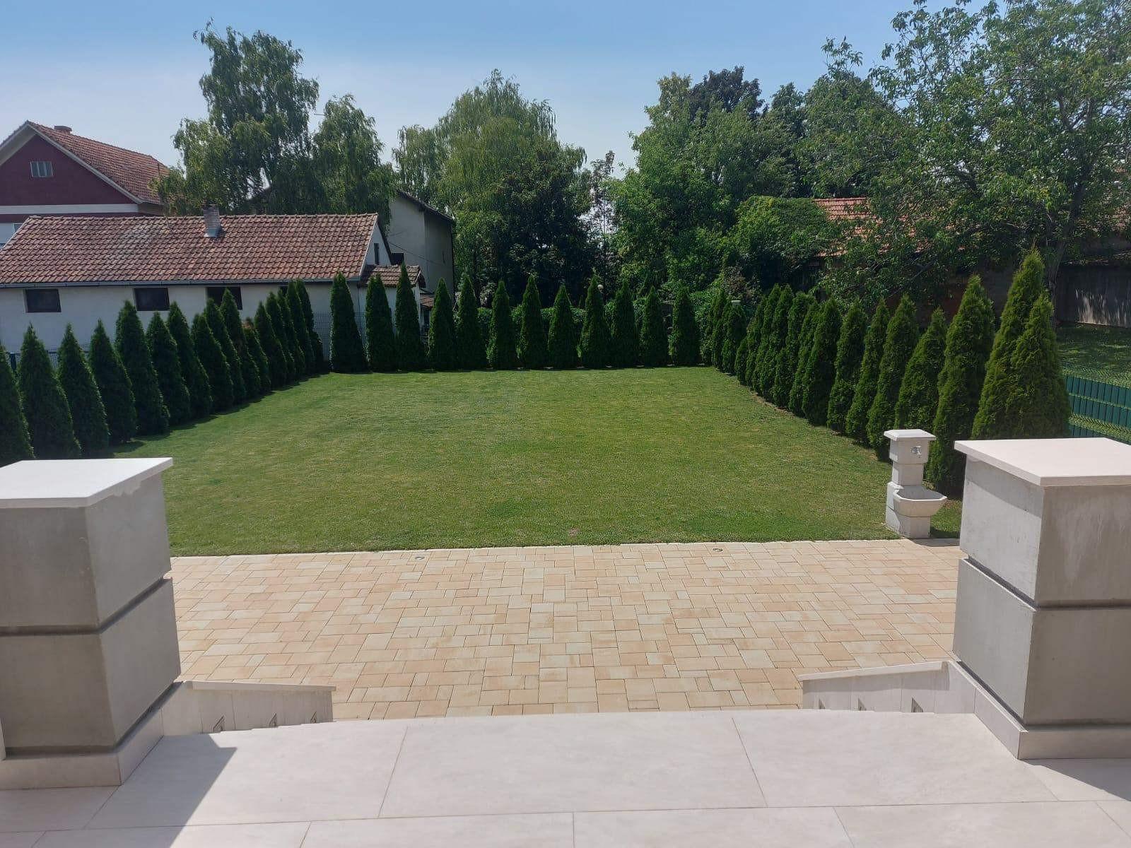 Nova lux kuća, centar Indjije, top lokacija Na prodaju nova, lux kuća u centru Inđije na top lokaciji. 1.Raspored prostorija: Podrum: garaža za 3 automobila, kotlarnica, 3 sobe. U 1 sobi odrađena pomoćna kuhinja. Prizemlje: velika dnevna soba spojena sa kuhinjom, trpezarijom, ostavom, 1 odvojena soba, kupatilo i 2 terase. Potkrovlje: 3 spavaće sobe, kupatilo, garderober i terasa. 2. Kvalitet gradnje: Zid je debljine 52cm, sendvič (termo blok, parna brana, stiropor 8 cm, cigla)+ stiropor 5cm. Ploče su pune betonske. Obavljen zaštitni premaz kompletne drvne građe. Stolarija aluminijumska, krovna Velux. Svi podovi odradjeni su u italijanskoj keramici. U svim sobama na sve 3 etaže priključci za telefon, internet, kablovsku tv na više pozicija. U dnevnoj sobi ugradjen kamin. U prizemlju spušteni plafoni. Topla voda u kuhinji i kupatilima preko Stiebel protočnih bojlera. Ceo unutrašnji odvod odrađen u bešumnim Geberit cevima. Potkrovlje moze da funkcioniše kao posebna stambena jedinica pošto je kompletna instalacija (2 električna brojila, voda, grejanje) razdvojena po etažama. Behaton Semmelrock. Kapije i ograde na terasama od aluminijumskih profila. Daljinsko otvaranje svih kapija. Za dekorativne elemente parapeta, klupica korišćen prirodni beli kamen sa ostrva Brač. Spoljna rasveta Eglo. Angažovan stručni nadzor tokom celokupnog perioda gradnje. Postoji obimna foto dokumentacija celokupnih radova. 3. Grejanje i hladjenje: Grejanje je podno na gas ili električnu energiju (kondenzacioni Bosch gasni kotao ili 2 električna kotla). Opcija dodavanje toplotnih pumpi bez prepravke postojeće instalacije grejanja. Ugradjen Panasonic invertet multi split sistem hladjenja i grejanja (2 spoljne i 6 unutrašnjih jedinica). 4. Zaštita i bezbednost: Odrađeno kvalitetno kabliranje u svim prostorijama i na svoj spoljašnjoj stolariji na sve 3 etaže za alarmni sistem unutra i video nadzor spolja. Na samo 173m2 površine smešteno je čak 380m2 korisne površine kuće tako da je 604m2 placa pod zelenilom i popločano. Zadnji deo placa miran, preko celog dana osunčan i idealan za izgradnju bazena. Kuća je uknjižena, bez tereta, vlasništvo 1/1. Postavljanje završne fasade gratis u boji po želji kupca. Kontakt: 0643886686