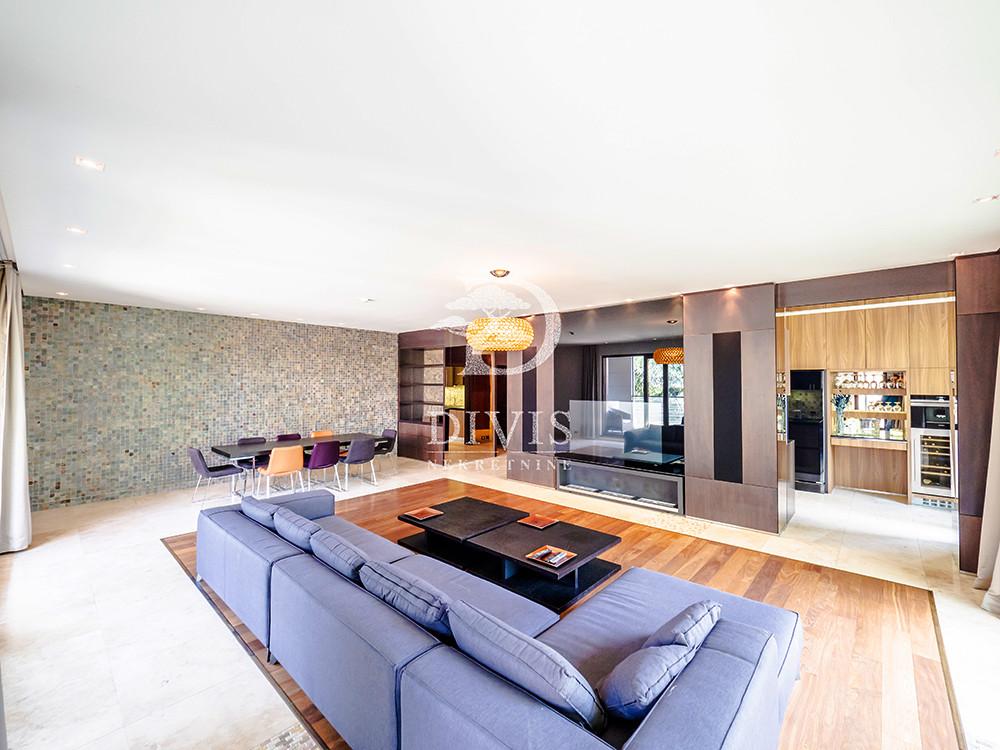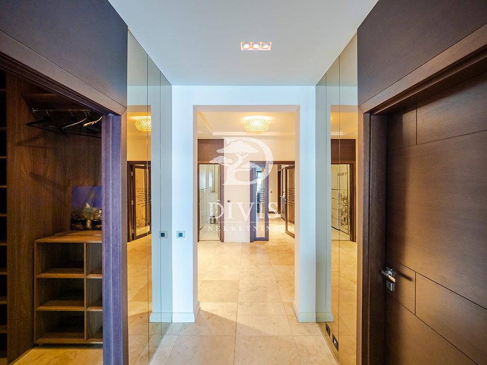 Prodajemo odličan četvorosoban stan od 234m2 sa tri parking mesta na Dedinju, u ulici Serdar Jola. Stan se nalazi na prvom spratu (na terenu u novijoj zgradi, izgrađenoj od najsavremenijih materijala i sa ugrađenom luksuznom opremom (panoramski lift, prostrana garaža sa led osvetljenjem, 24h video i fizičko-tehničko obezbeđenje…). Stan je podeljen u dve zone (dnevna i spavaća). Dnevna se sastoji od velikog dnevnog boravka sa izlazom na veliku terasu, prostrane kuhinje, dela za trpezariju, velikog garderobera i gostinskog toaleta. Spavaća zona se sastoji od hodnika, tri prostrane spavaće sobe (svaka soba ima svoje kupatilo), ugradnih plakara. Iz svake spavaće sobe se izlazi na terasu. Na podu terasa je decking pod dok je terasa natkrivena žaluzinama. Visina plafona od 2.85m. U stanu ostaju ugradni plakari, kompletna kuhinja sa uređajima, kao i ugradni elementi u dnevnom boravku. U cenu stana je uključeno jedno parking mesto u garaži i dva parking mesta na parceli. Uknjižen, bez tereta i zabeležbi. Izuzetno retko u ponudi. Za svaku preporuku! Posrednička naknada je u skladu sa Opštim uslovima poslovanja Posrednika DIVIS NEKRETNINE DOO.