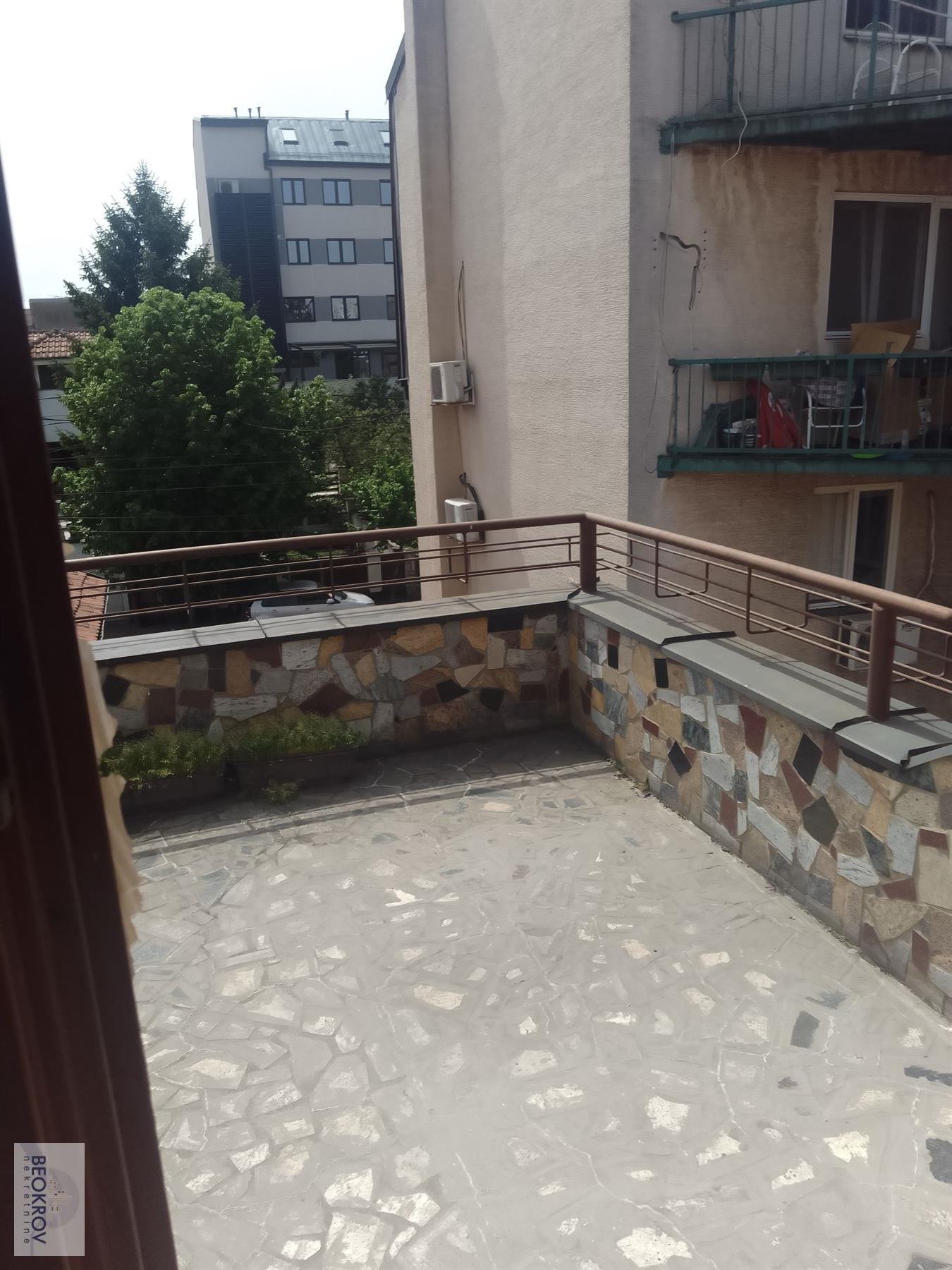 Trenutno poslovno stambena zgrada,koja se sastoji od suterena, vis. prizemlja, I sprata i potkrovlja i dvorišna kuća, pr+I sprat. U većoj zgradi, u suterenu je radionica; u v.prizemlju i na I spratu p.prostori( po 2 terase), dok je u potkrovlju stan-garsonjera i 2 terase. Suteren, uz proširenje ulaza, može služiti kao garaža. Postoje 2 ulaza u suteren i 1 u prizemlje. Stepenište i hodnik dvorišnog ulaza obloženi su mermerom. Pogodno i za stanovanje i zza poslovni prostor. Zakupac plaća proviziju u iznosu u visini od pola 1 mesečne zakupnine. 069 2365768