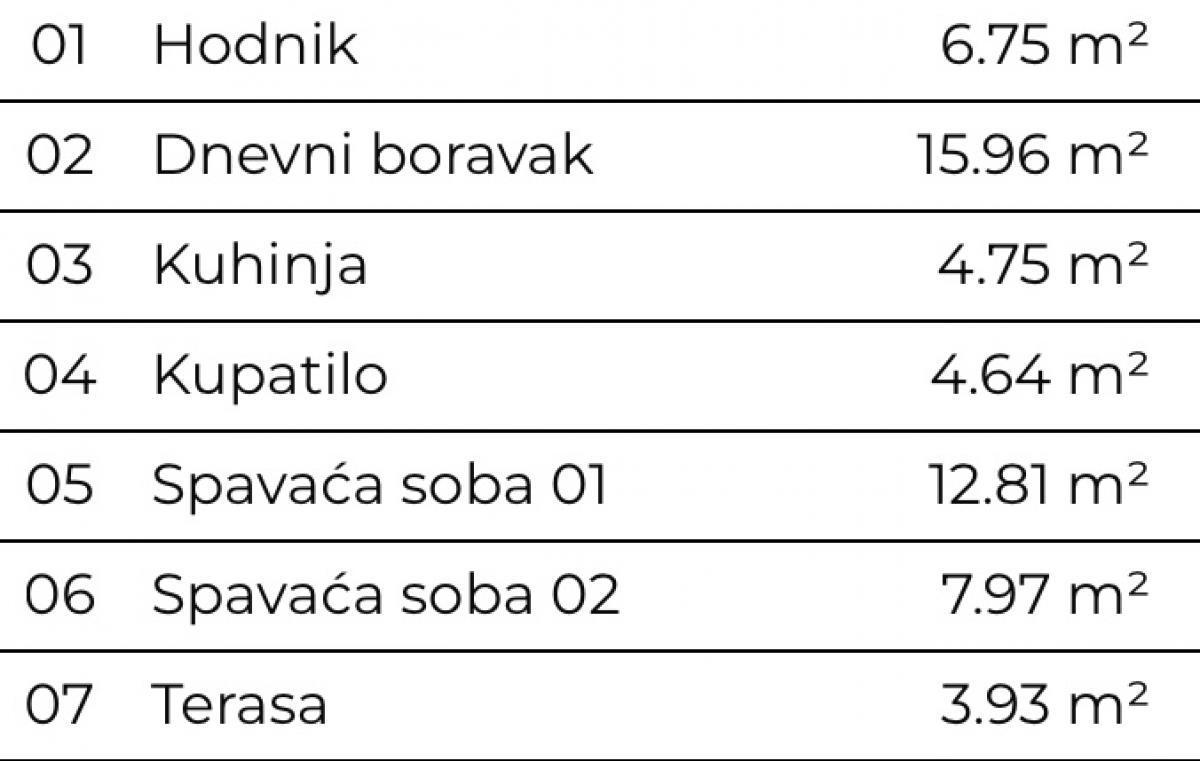 PRODAJA TROSOBNOG STANA 56,81 m2 – TELEP, NOVI SAD 56,81 m2, VII sprat *Na prodaju moderan trosobni stan površine 56,81m², smešten na sedmom spratu kvalitetne novogradnje na Telepu – jednoj od najtraženijih lokacija u Novom Sadu. *Stan je odlično organizovan: 01 Hodnik 6.75 m² 02 Dnevni boravak 15.96 m² 03 Kuhinja 4.75 m² 04 Kupatilo 4.64 m² 05 Spavaća soba 01 12.81 m² 06 Spavaća soba 02 7.97 m² 07 Terasa 3.93 m² *Objekat odražava savremen dizajn, izgrađen je od visokokvalitetnih materijala, uz energetski efikasna rešenja koja obezbeđuju niske troškove grejanja i hlađenja tokom cele godine. *U neposrednoj blizini nalaze se škole, vrtići, parkovi, kao i svi ključni sadržaji potrebni za ugodan gradski život. Odlična infrastruktura omogućava brz pristup centralnim delovima grada. *Veliko privatno dvorište sa dečijim igralištem *Zgrada opremljena video-nadzorom i optikom *Garaža sa rampom i video-nadzorom *U garaži obezbeđena parking mesta sa punjačima za električna vozila ***Agencija Dva zvona 1963*** +381648960226