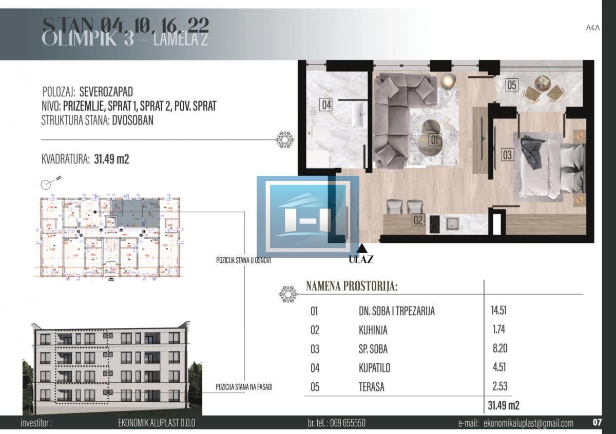 Rok završetka: mart 2026. Moguć povraćaj PDV-a Predstavljamo odličnu priliku za kupovinu jednosobnog stana u modernoj zgradi u izgradnji, smeštenoj u jednoj od najtraženijih zona Vrnjačke Banje. Grad sa tradicijom, lekovitim izvorima i turistima tokom cele godine čini ovu nekretninu savršenom kako za život, tako i za izdavanje. Prednosti ove nekretnine: *Crna aluminijumska stolarija i moderna keramika *Električne roletne za dodatni komfor *Klima uređaj uključen u cenu *Lift i privatno parking mesto *Kupovina direktno od investitora uz mogućnost povraćaja PDV-a *Stan je odličan izbor za one koji žele kvalitetan život u prirodnom okruženju, kao i za investitore koji traže sigurnu i dugoročnu zaradu kroz izdavanje. Lokacija: Mirno naselje u blizini Akva parka, idealno pozicionirano za svakodnevni život, ali i za turiste. Pozovite nas i rezervišite svoju nekretninu na vreme. Broj stanova je ograničen. 064/8312081 | 064/8312064 Heroldo, 13. oktobar br. 5, Ćuprija