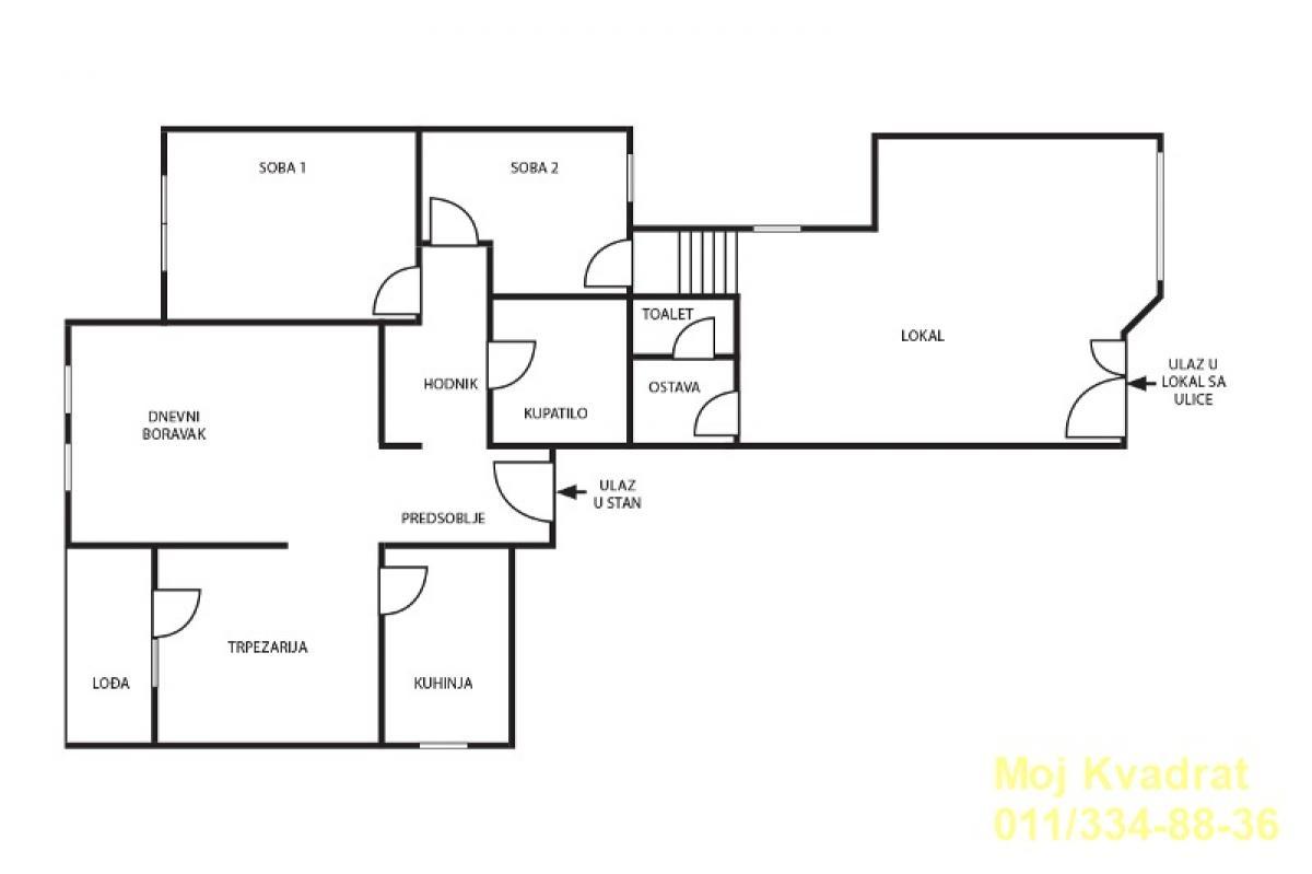 Zvezdara, Vukov spomenik - Zahumska 3.0, 108m2 (stan 70m2 + lođa 4m2 + poslovni prostor 34m2), VPR/5, CG, lift, interfon, podrum U ponudi stan 74m2 sa poslovnim prostorom 34m2. Poslovni prostor se nalazi u prizemlju, a stan na visokom prizemlju i povezani su sa 4 stepenika. Stan se sastoji od dnevnog boravka, trpezarije sa izlazom na lođu, kuhinje sa prirodnom ventilacijom, dve spavaće sobe, kupatila i hodnika. Visina plafona u stanu iznosi 2,70m. Stan poseduje i pripadajući podrum. Poslovni prostor ima jednu prostoriju i mokri čvor. Visina plafona iznosi 3,40m. Stan se prodaje sa nameštajem, a može i bez. Poslovni prostor se prodaje sa nameštajem i idealan je za advokatsku kancelariju, knjigovodstvenu agenciju, ordinaciju... Stan i prostor su uknjiženi na firmu. Retko u ponudi kombinovanje ličnog života i posla. Odlično kao investicija. Uknjižen stan na 70m2, mereno sa lođom ima 74m2 i uknjižen poslovni prostor na 34m2. Agencijska provizija 2% Agent: Vojka Joksović 064/55-55-196 (licenca br.1790)