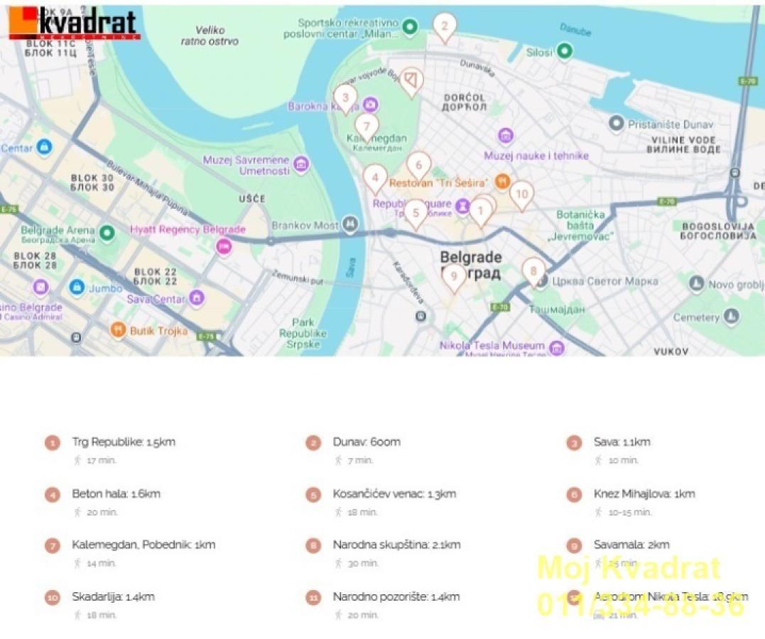 Stari grad, Dorćol - Dunavska - K-District - useljiv, jedinstven životni stil! 4.0, 117m2 (terasa 9m2), 1/4, CG, dva lifta, telefon, interfon, video nadzor, dve garaže U ponudi je komforan i svetao četvorosoban stan, koji se nalazi na jedinstvenoj lokaciji u najstarijem jezgru Beograda - u kulturno istorijskoj celini Kalemegdana, uz Savu i Dunav, u novoizgrađenom stambenom kompleksu K-District na Dorćolu. Stan je na pešačkoj udaljenosti od sportskog centra 25. maj i budućeg linijskog parka. Prodaje se kompletno opremljen nudeći izuzetan komfor i stil života budućim stanarima. Čine ga prostran dnevni boravak povezan sa trpezarijom i kuhinjom, master spavaća soba sa kupatilom, dve spavaće/dečije sobe, kupatilo, toalet za goste sa vešernicom, kao i prelepa terasa sa pogledom na unutrašnjost kompleksa i 25.maj. Prostor je izuzetno svetao, velikih staklenih površina, sa visinom plafona od 2,80 m. Enterijer je moderno dizajniran i opremljen kvalitetnim nameštajem, ugradnom tehnikom, klima uređajem i rasvetom. Stanu pripadaju dva garažna mesta na 1. nivou, sa cenom od 30.000e za svako. Zgrada poseduje dva lifta, obezbeđenje, portira, video nadzor, kao i sopstveni garažni prostor. Pored stambenog i poslovnog, K-District ima sadržaje namenjene deci, odmoru i rekreaciji, dok prodavnice, restorani, kafei, knjižare i galerije kompletno naselje čine udobnim, prijatnim i potpunim. Kompleks je bogat drvećem i zelenilom, a poseban kvalitet donosi mu buduća promenada – široka pešačka zona koja će ostaviti otvoren pogled sa Kalemegdana ka reci, a svojim uređenim šetalištem povezivati Beogradsku tvrđavu sa Beton halom i Dunavom. Kalemegdan i Luka Beograd dobijaju novu, prirodnu sponu. Za deset minuta hoda stižete u Knez Mihaillovu, a za petnaest ste u Narodnom pozorištu. U Zoo vrtu ili parku - za pet. Od Savamale vas deli svega dva kilometra, a od Skadarlije tek kilometer i po. I strogi centar grada i poslovne zone, i kulturnoistorijski spomenici i čvorišne infrastukturne tačke, i druga gradska obala i najpoznatija gradska promenada – sve vam je tu. Građevinska dozvola. Agencijska provizija 2%