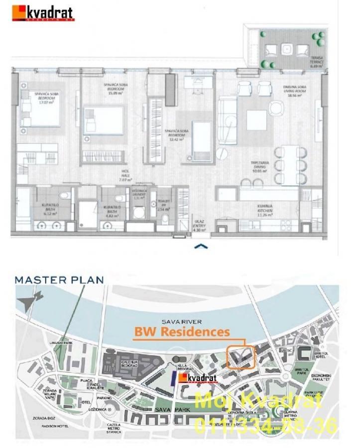 Savski venac, Beograd na vodi - Hercegovačka (BW Residences) - PRESTIŽ PRIPADA PRVOM REDU DO REKE 4.0, 117m2 (terasa 6m2), CG, lift, 6/20, telefon, interfon, garaža Moderni četvorosobni stan sa prostranim sobama i prozorima od poda do plafona, projektovan tako da kreira svet savremenog komfora ukomponovanim sa urbanim duhom. Pogled ka Savi i Kalemegdanu iz dnevne zone, kao i iz svake spavaće sobe, oduzima dah. U blizini su i najveći tržni centar u regionu - Galerija, impresivna Kula Beograd – St. Regis Residences i Savski Park. Udobnost života u BW Residences je bez premca u Beogradu. Prostor za rekreaciju sadrži teretanu, bazene za decu i odrasle, kao i igraonicu za najmlađe, a stanari imaju i pristup privatnoj bašti. U prizemlju zgrade se nalaze brojni poznati lokali i kafići gde možete provoditi prijatne trenutke sa bliskim ljudima. Moguća je kupovina garažnog mesta na nivou -1 po ceni od 40.000 eura. BW Residences je prvi stambeni objekat u okviru Belgrade Waterfronta namenjen kako mladim, urbanim profesionalcima, tako i porodicama koje žele život u modernom domu u okviru lepo održavanog i sigurnog stambenog ambijenta. Karakteristike: ♦ Ulazni lobi sa recepcijom, obezbeđenjem i izdvojenim delom za prijem pošte, ♦ Podzemna garaža, parking za bicikle, ♦ Koncept otvorene kuhinje, višeslojni parket u sobama, ♦ Prozori od poda do plafona, ♦ Pločice na podu i zidovima u kupatilu, i podu u kuhinji, ♦ Kupatilo opremljeno sanitarijama, ugradna tuš kabina sa staklenim paravanom, ♦ Bazen i teretana. Uknjižen na 117m2 korisne površine. Agencijska provizija 2%