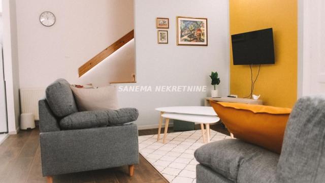 STAN Prodaje se trosoban stan od 91m2 u pešačkoj zoni na prvom spratu. Stan je izuzetno lepo renoviran i čine ga predsoblje, velik i osunčan dnevni boravak sa trpezarijom i kuhinjom, ostava, spavaća soba sa garderoberom, kupatilo, a iznad tog dela stana u visokom potkrovlju se nalazi još jedna odvojena spavaća soba. Prozori i ulazna vrata su nova PVC, po podu kvalitetan laminat, nova elektro i vodovodna instalacija. Grejanje je centralno, stan ima sopstvni kotao na struju. U stan se novi kupac može odmah useliti, jer nisu potrebna nikakva ulaganja. CENA 103.000e za dogovor.