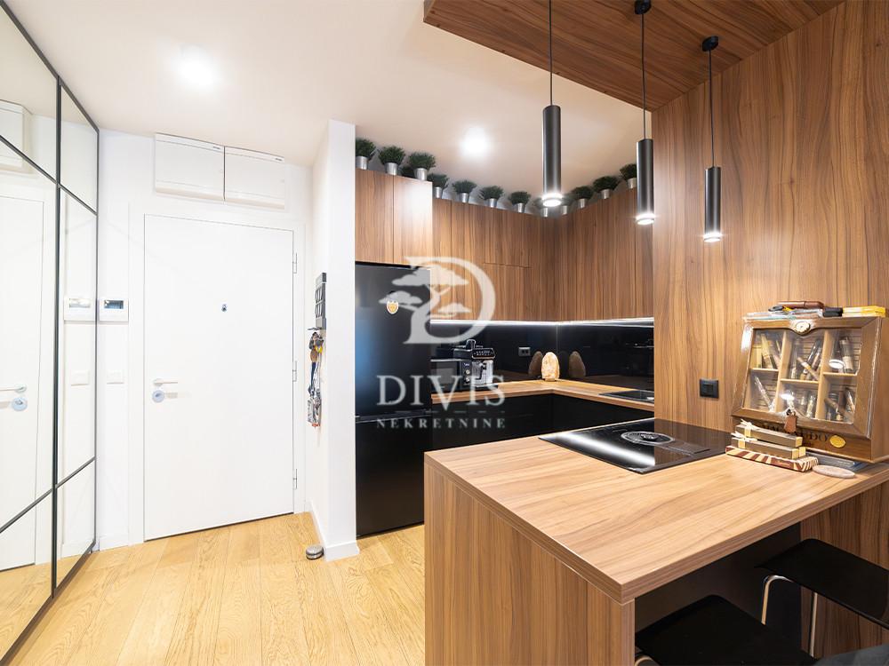 Prodaje se luksuzno opremljen dvosoban stan u u poznatom stambenom kompleksu K-District na Dorćolu, u jednoj od najtraženijih zona centra Beograda. Stan se nalazi na trećem spratu i izuzetno je svetao, sa otvorenim pogledom. Sastoji se od ulaznog hodnika, dnevnog boravka sa kuhinjom, spavaće sobe, kupatila i terase. Prodaje se potpuno opremljen, a prilikom opremanja korišćeni su kvalitetni materijali, dok je nameštaj pažljivo biran radi maksimalnog komfora. Lokacija kompleksa omogućava brz pristup glavnim saobraćajnicama, kao i neposrednu blizinu Kalemegdana, sportskog centra 25. Maj i svega 15 minuta hoda do Trga Republike. U okolini se nalaze brojni sadržaji koji ovaj stan čine idealnim za porodičan život ili investiciju. Uz stan se prodaje garažno mesto po ceni od 36.000 €. Posrednička naknada naplaćuje se u skladu sa Opštim uslovima poslovanja posrednika DIVIS NEKRETNINE DOO.